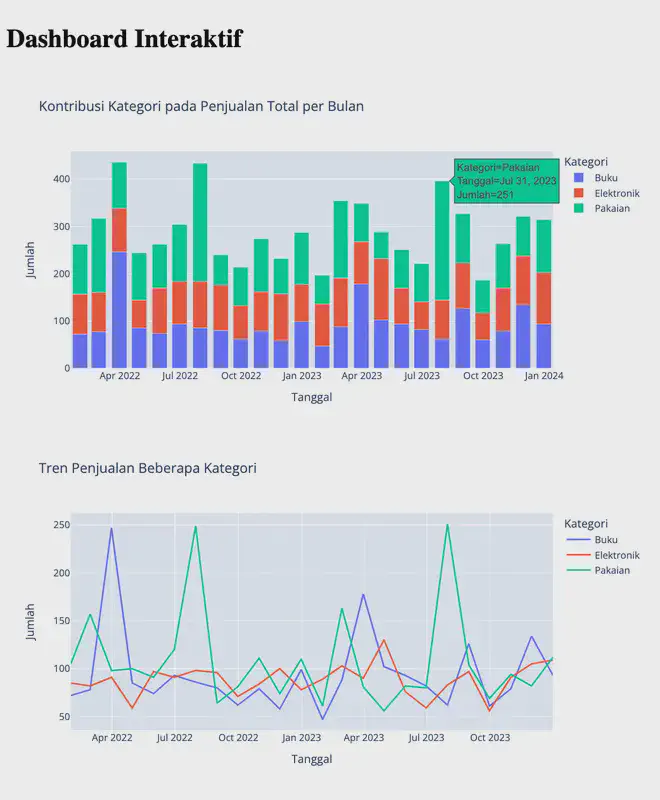 Pada bagian ini kita akan membuat drop down dan slider untuk mengontrol tampilan grafik. Dropdown berisi tahun (2022 dan 2023), sedangkan slider berisi bulan (Jan, Feb, Mar, …, Des). Sedangkan grafik berisi grafik penjualan harian dalam bentuk stacked bar dengan coloring Kategori pada bulan dan tahun yang sesuai dengan di dropdown dan slider. Jika slider dan dropdown berubah, maka grafik penjualan harian ikut berubah.