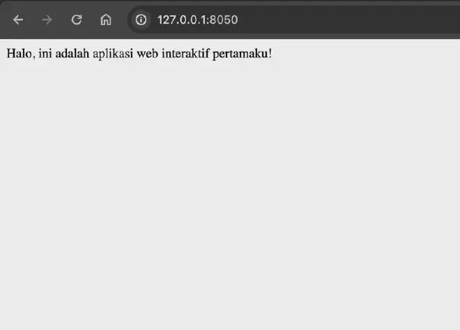 Aplikasi web Dash sederhana yang menampilkan pesan “Halo, ini adalah aplikasi web interaktif pertamaku!” sekarang dapat diakses melalui browser kamu.